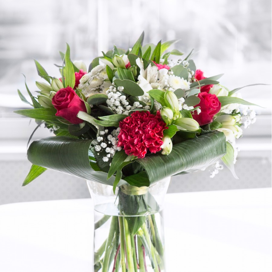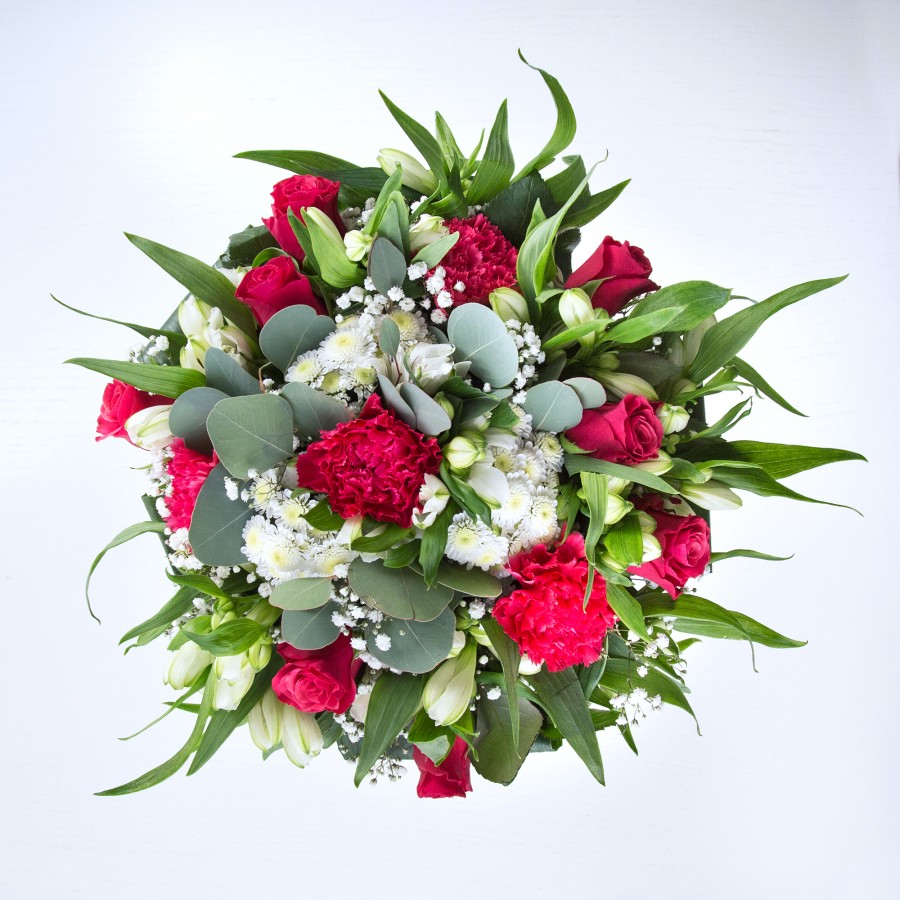 Delight in the luxury of our floral bouquet, expertly curated with a vibrant selection of colors and premium blooms. This exquisite arrangement features sweet white chrysanthemums, delicate gypsophila, striking red roses, and elegant carnations, harmoniously arranged with white alstroemeria and rich aspidistra leaves.