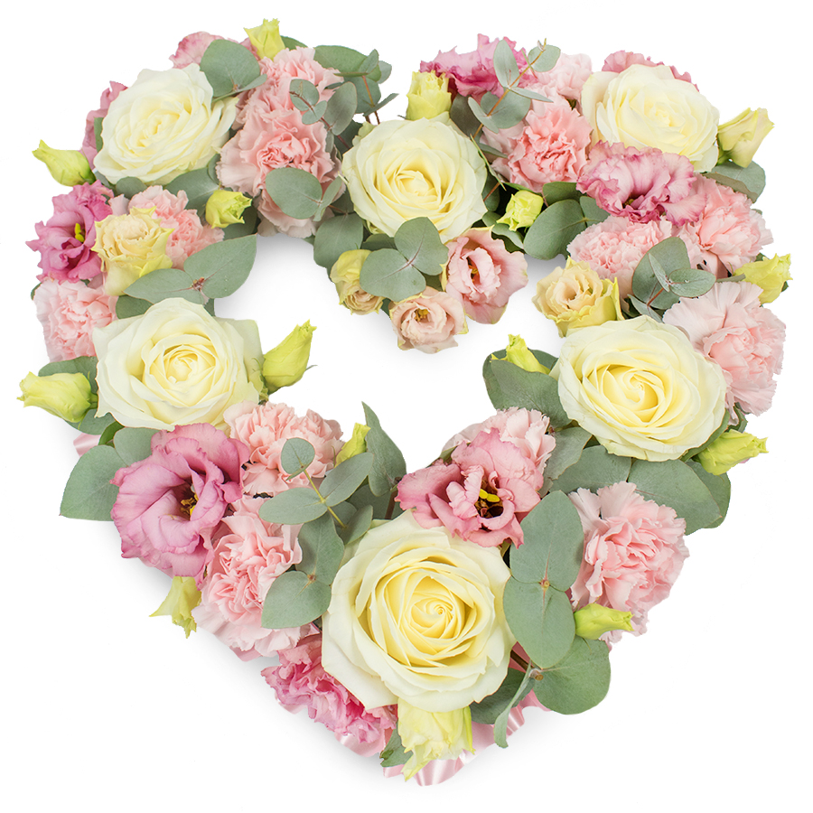 Express your deepest sentiments with our Elegant Open Heart Bouquet, meticulously crafted to convey love and remembrance. This stunning arrangement features a harmonious blend of crisp white roses, soft pink carnations, delicate pink lisianthus, and lush eucalyptus leaves, creating a visually captivating display.
